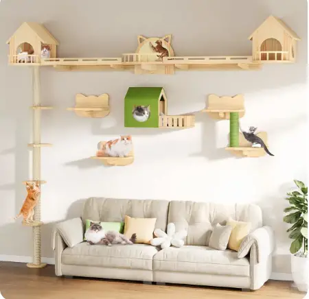 Cats really enjoy having different paths to explore, so mixing bridges with regular shelves creates an exciting playground. The bridges should be wide enough for cats to walk across, but not so wide that they might fall off.
