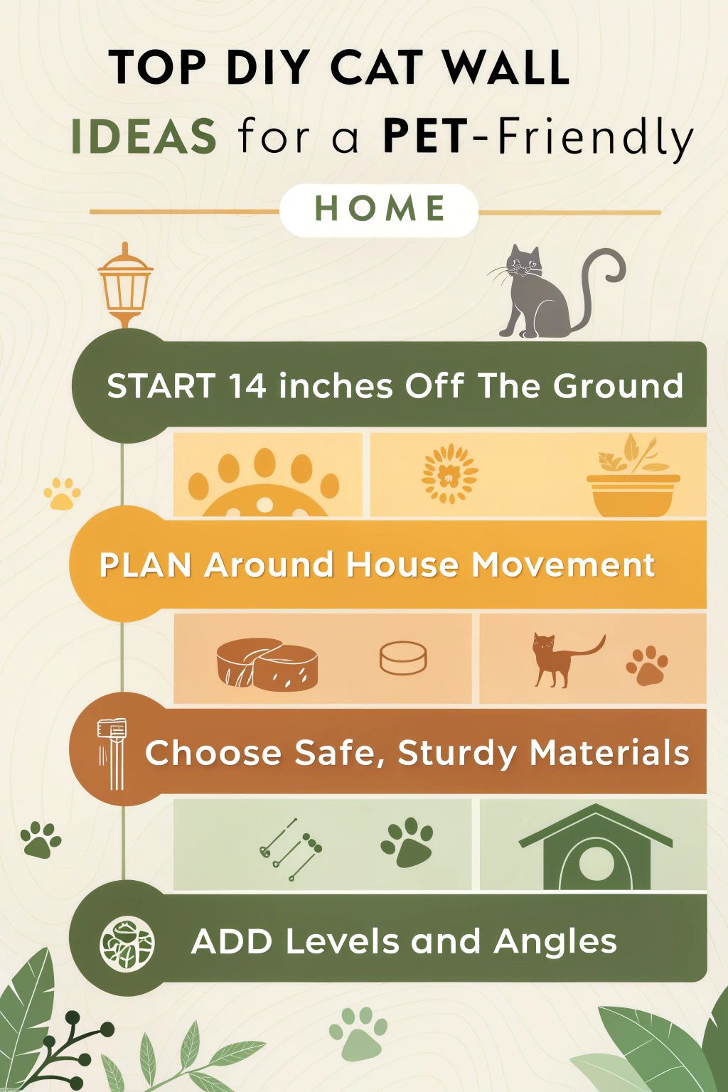 I start my cat wall at about 14 inches off the ground. This makes it easy for my cats to jump on. I always make sure to find wall studs near corners and doorways. This helps keep everything stable.