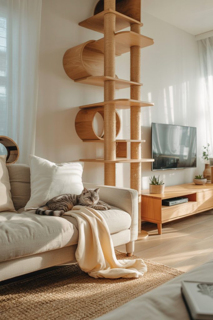 Using wall-mounted shelves and tall scratching posts can make a small apartment perfect for cats. These climbing systems let them explore up high, keeping them happy and active.