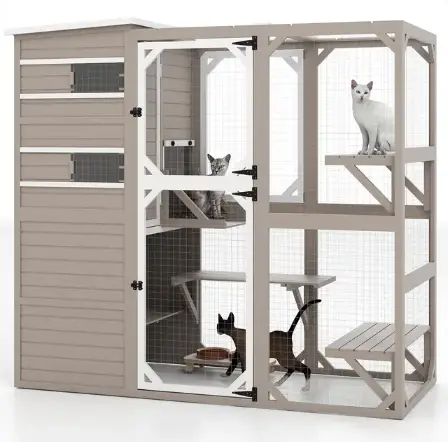 Incorporating scratching posts and climbing areas adds an element of play. Cats love to climb and scratch, and this catio has it all. The natural wood finish blends well with the outdoor setting, adding a touch of style to your backyard.